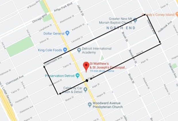 1. Marchers exit St. Matthew/St. Joseph Episcopal Church at 1;30 PM and gather on King Street, just east of Woodward Ave.